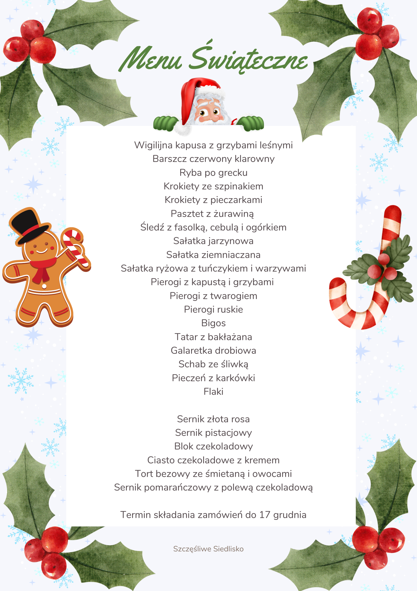 Zamówienie na kolację Wigilijną w kwocie 500 zł jest wliczone w cenę pobytu. Pobierz świąteczne menu.